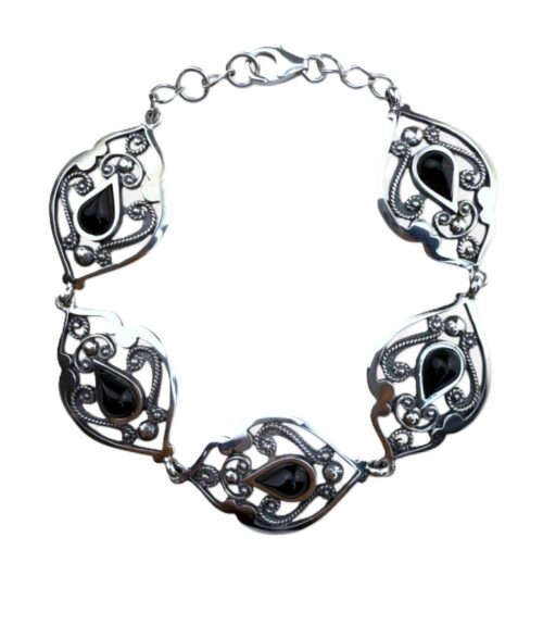 Pulsera brazalete en Plata y detalles de Azabache en forma de lágrima. Artesanía de Galicia.