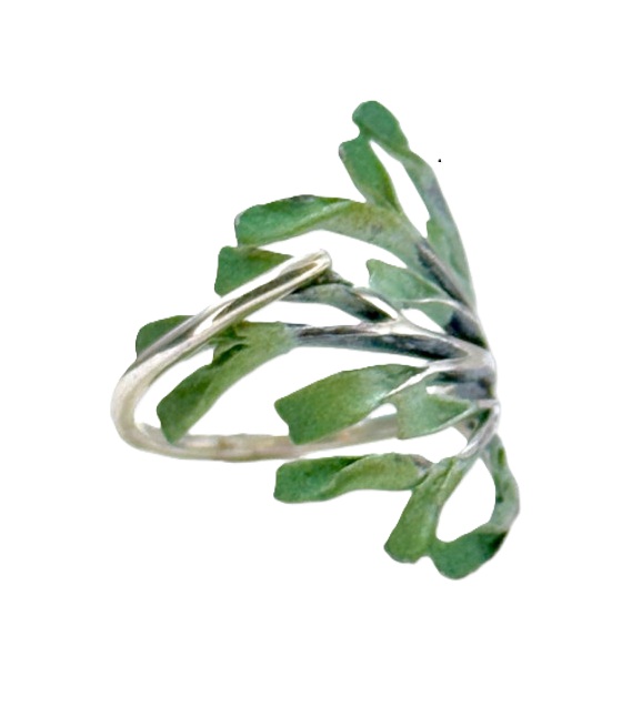 Anillo ajustable en Plata de Primera de Ley, con forma rama de árbol. Combina la plata en brillo y óxido y los pigmentos naturales metálicos. Realizados con la técnica SIMELTECH®. Medidas desde la 10 hasta la 24. Colores Verde y Azul.