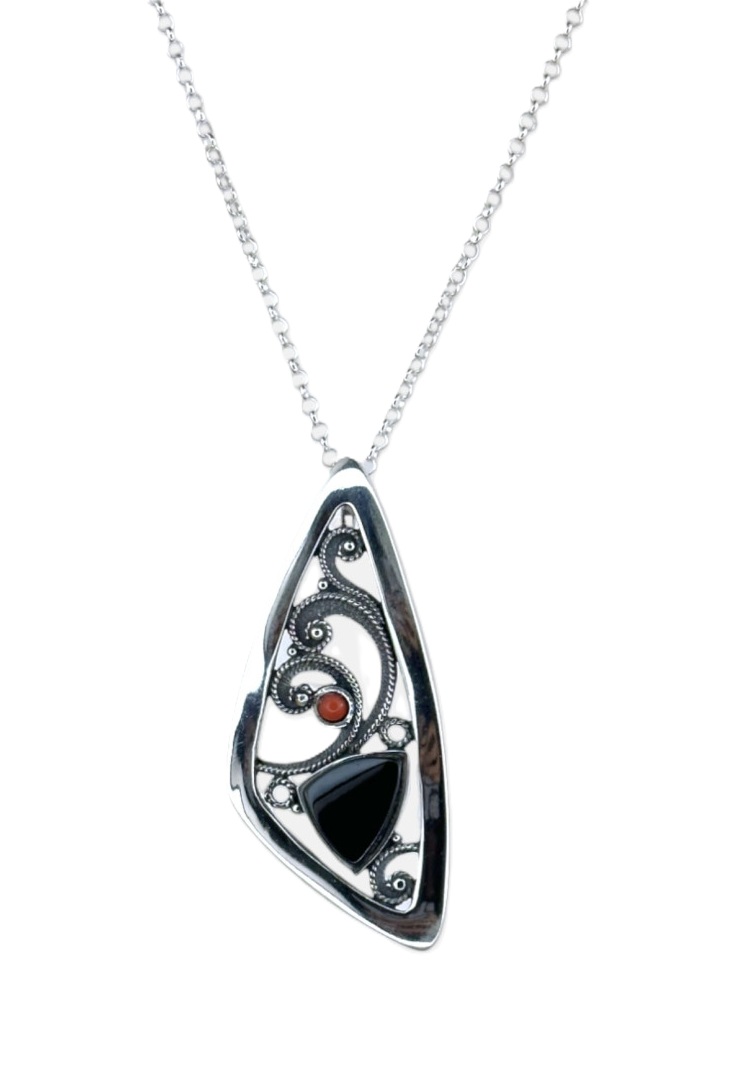 Colgante en Plata Primera de Ley con Azabache y cabujones de Coral. Dos medidas diferentes 50×23 mm. y 31×10 mm. ; montado en cadena de Plata. Un diseño tradicional y elegante. Artesanía de Galicia.