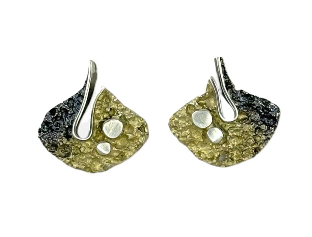 Pendientes en Plata Primera de Ley de la Colección Atlanti. Combina la plata en brillo y óxido y los pigmentos naturales metálicos. Realizados con la técnica SIMELTECH®. Medidas 17×18 mm. con cierre de presión. Disponible en varios colores.