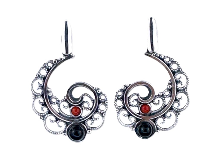 Pendientes en Plata Primera de Ley, con filigrana, Azabache y cabujón de Coral. Medidas 49×36 mm. con un peso 4.7 gr. y cierre de presión móvil. Un diseño tradicional y elegante. Artesanía de Galicia.