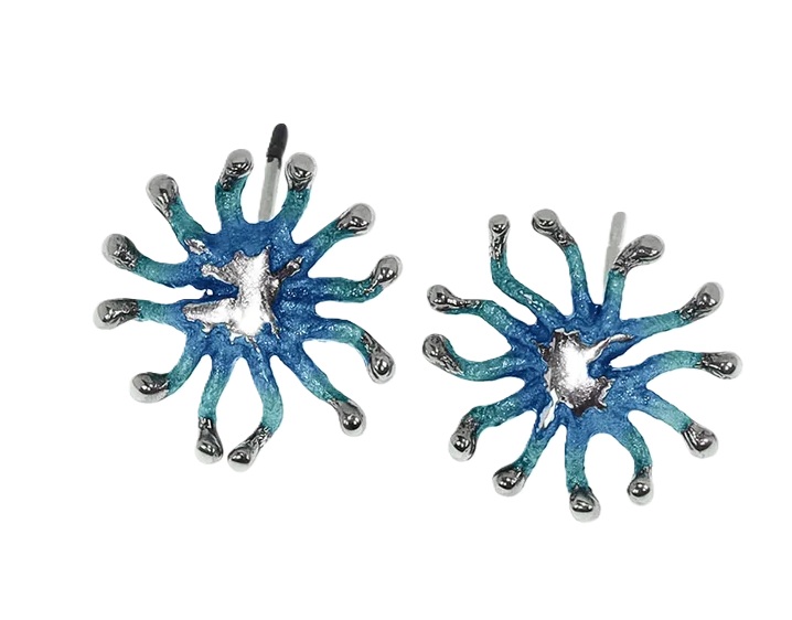 Pendientes en Plata Primera de Ley, Colección Agar. Combina la plata en brillo y óxido y los pigmentos naturales metálicos. Realizados con la técnica SIMELTECH®. Medidas 13×14 mm. cierre de presión, disponible en varios colores .