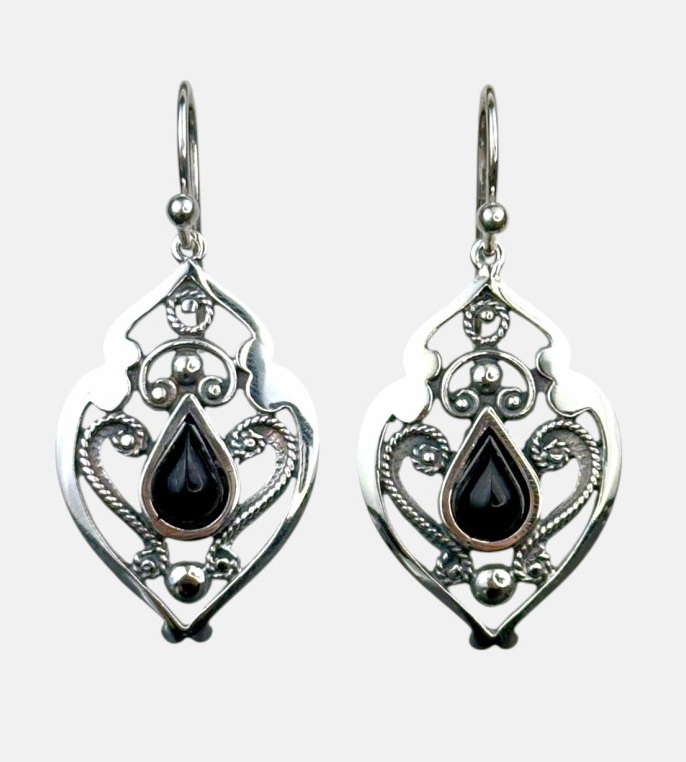 Pendientes de gancho móvil en Plata Primera de Ley, con filigrana y Azabache en forma de lágrima. Medidas de largo 41×20 mm. y peso 2.2 gr. Un diseño tradicional y elegante. Artesanía de Galicia.