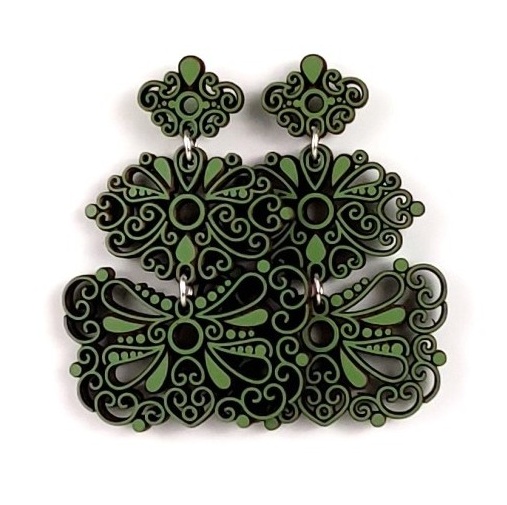 Pendientes triples Aderezo de Madera, con cierre de tuerca de presión en Plata de Primera Ley. Medidas de la pieza 38×56 mm.