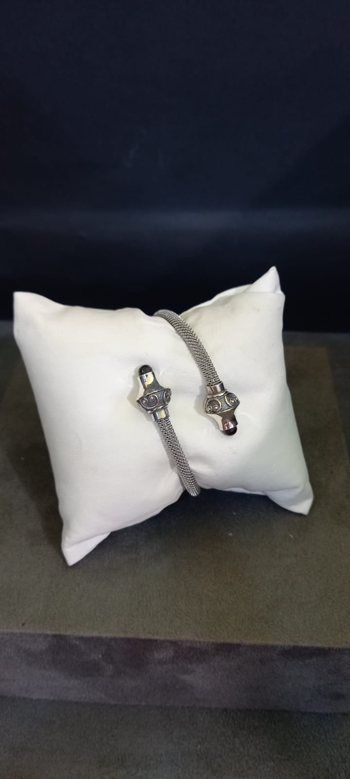 Brazalete Torques Celta filigrana, abierto y ajustable con alma de acero para evitar deformar el arco y en Plata Primera de Ley rematado en cabezales de Azabache.