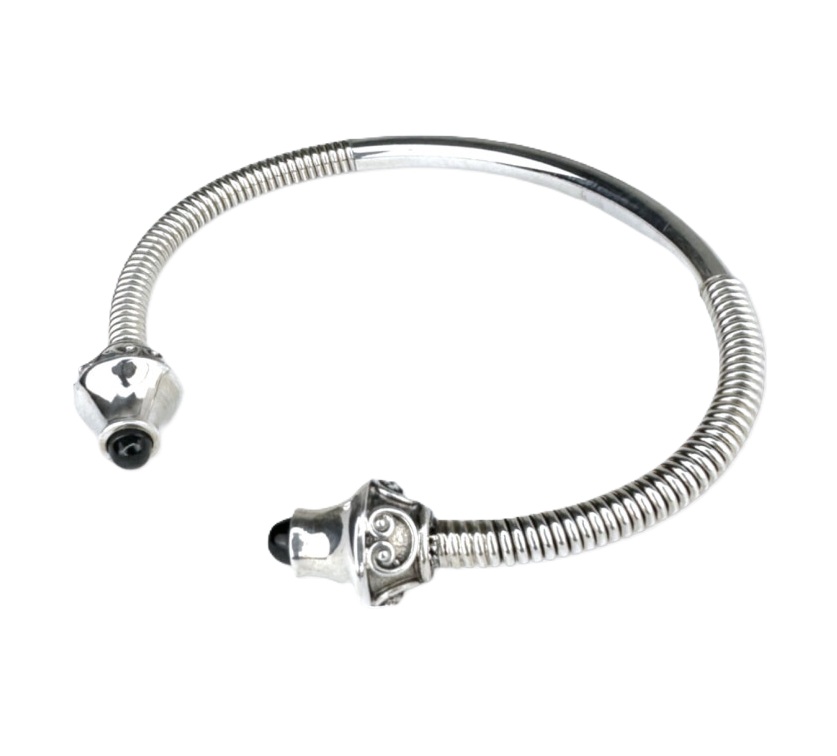 Brazalete Torques Celta en Plata Primera de Ley y rematado en cabezales de Azabache. Artesanía de Galicia.